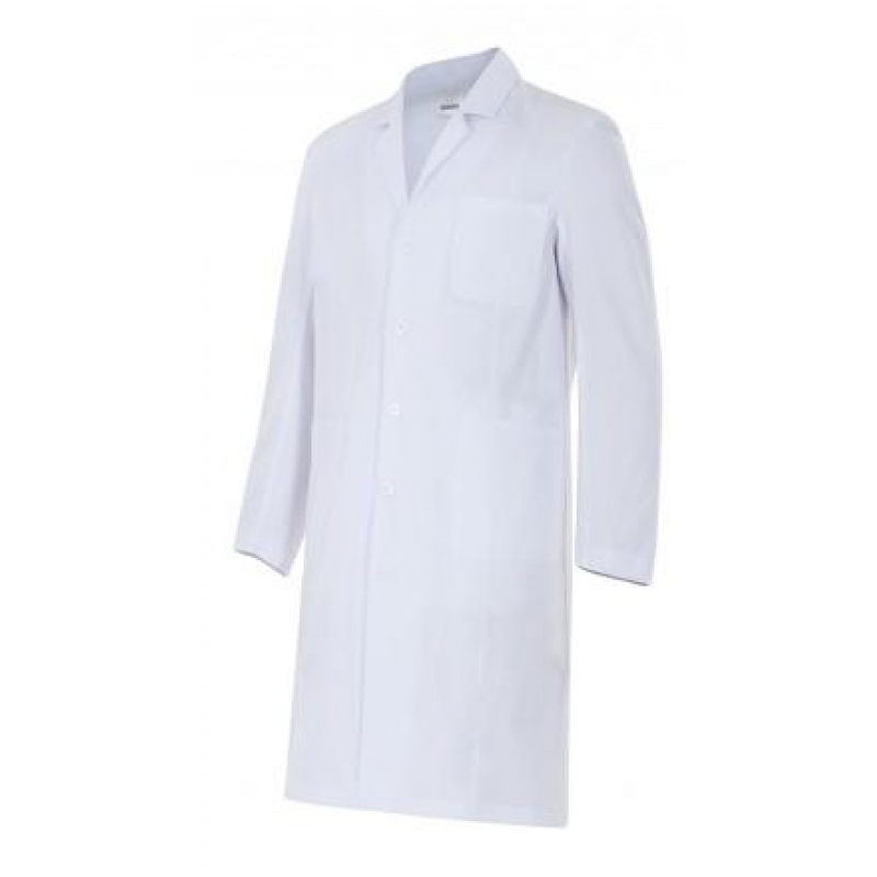 Bata de hombre entallada con cierre central de botones. Manga tipo sastre, de dos piezas, cuello con solapa y tres bolsillos de parche, dos inferiores y uno en el pecho izquierdo. Cinturón en la espalda.