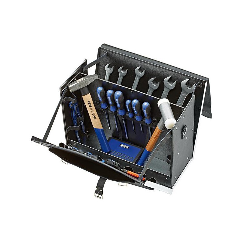 Maleta de herramientas de cuero de bovino, medidas interiores 450 x 190 x 340mm, bandeja de fondo de chapa de acero galvanizado, pared delantera y trasera con 8 bolsillos cada una, paredes delantera y trasera semiplegables, pared central fija, 9 hebillas ajustables y 8 fijas, lazos de sujeción para nivel de burbuja, 1 correa envolvente, maleta reforzada con esquinas de aluminio, pies, bolsillo delantero, 2 anillas de transporte, asa , permite cerrarse con 2 cerraduras. Suministro: sin herramientas.