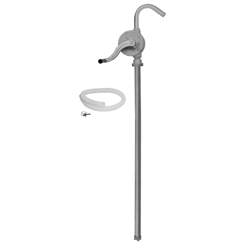 Bomba autoaspirante manual de fundición con accionamiento rotatorio para transvase de gasóleo, petróleo, aceite y otros fluidos no corrosivos de baja viscosidad. Incorpora: cuerpo de bomba realizado en hierro fundido y eje en acero, adaptador 2” BSP (M) ajustable en altura para fijación a bidón, tubo de succión realizado en 3 piezas (para utilización en bidones de 25, 50 o 205 l) y flexible de salida de 1 m. Entrega 0,3 l por revolución.