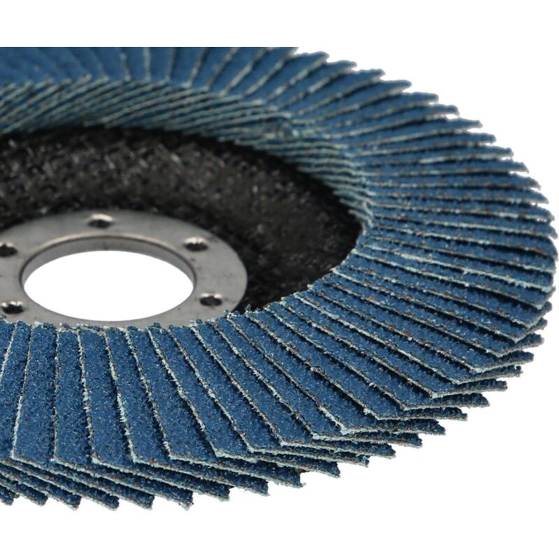 Muela abrasiva tipo abanico (diám. 115 mm, 13300 rpm), 12° convexa. Disco abrasivo de láminas, corindón de circonio, plato de fibra de vidrio, orificio normal 22,23mm, para rectificado de superficies y de costuras de soldadura en acero y acero inoxidable.