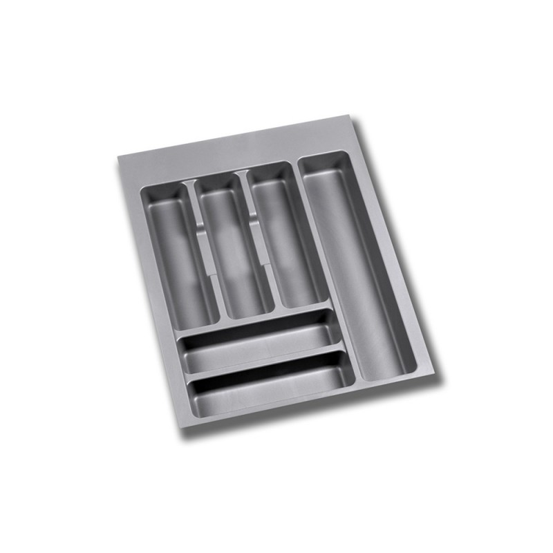 Cuberteros para cajones de cocina universales con un diseño recto y gran capacidad de almacenaje para cubiertos y otros utensilios de cocina aprovechando al máximo el espacio. Debido a que son recortables se pueden dimensionar para su uso con cajones montados en módulos de ancho estándar entre 400 mm y 900 mm, de profundidad entre 450 mm y 500 mm con tablero de espesores entre 16 mm y 19 mm según el modelo seleccionado.