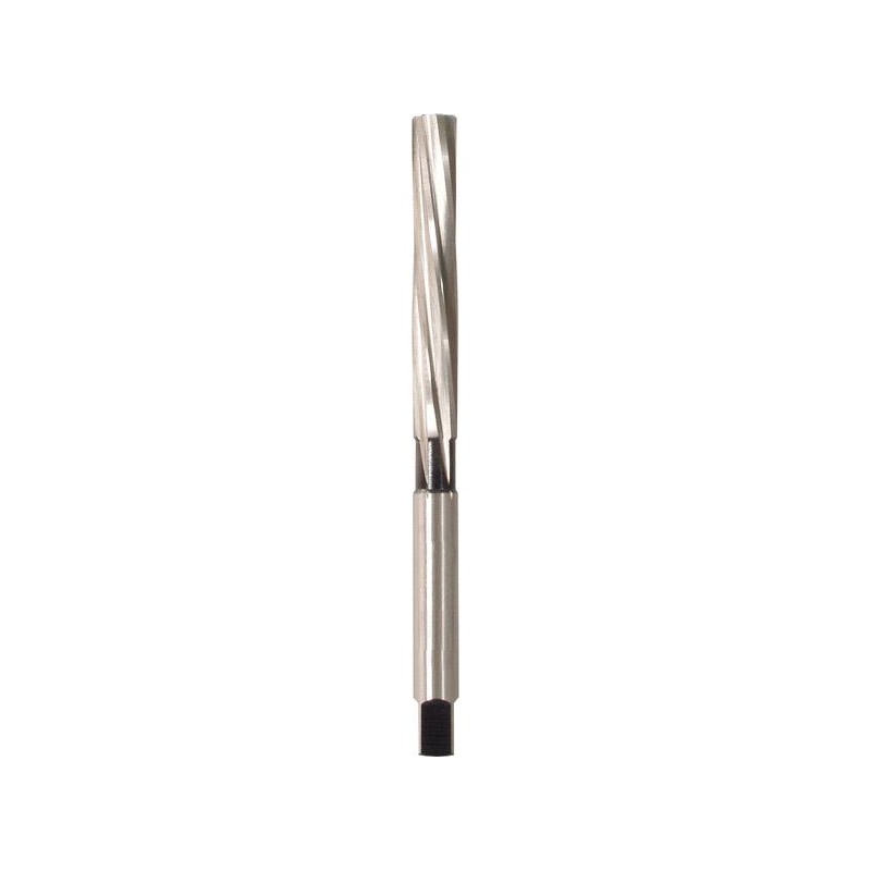 Escariador manual, vástago cilíndrico, HSS, DIN 206 B, espiral a izquierda 7°. Corte largo, cónico (aproximadamente 1/3 de la longitud de corte). Distribución dientes impar, vástago cilíndrico cuadrangular, tolerancia de perforación H7. Nota: debido al primer corte largo, cónico-que permite un mayor avance, comparado con un escariador de ranura recta-no apto para el mecanizado de agujeros ciegos. Otras dimensiones o de ranurado recto disponibles a petición.