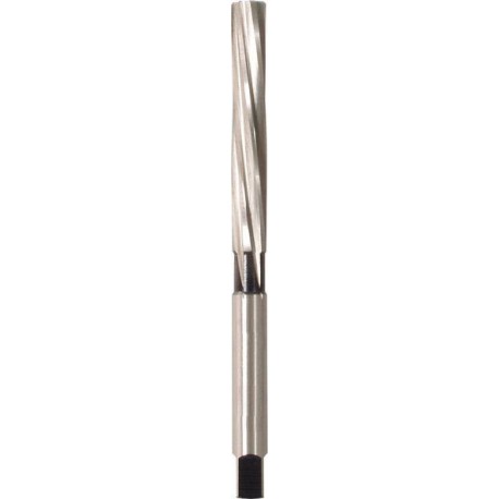 Escariador manual, vástago cilíndrico, HSS, DIN 206 B, espiral a izquierda 7°. Corte largo, cónico (aproximadamente 1/3 de la longitud de corte). Distribución dientes impar, vástago cilíndrico cuadrangular, tolerancia de perforación H7. Nota: debido al primer corte largo, cónico-que permite un mayor avance, comparado con un escariador de ranura recta-no apto para el mecanizado de agujeros ciegos. Otras dimensiones o de ranurado recto disponibles a petición.