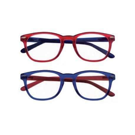 Gafas de lectura PRONTIXTE de colores satinados con un gran campo de visión. Montura unixex en ligero material orgánico inyectado. Lentes esféricas extrafinas e irrompibles. Colores satinados rojo y azul. Graduaciones: +1.00, +1,50, +2.00, +2.50, +3.00, +3,50. Incluyen funda en símil piel de color. Producto CE conforme a la normativaEN 14139:2010. Garantía 2 años.