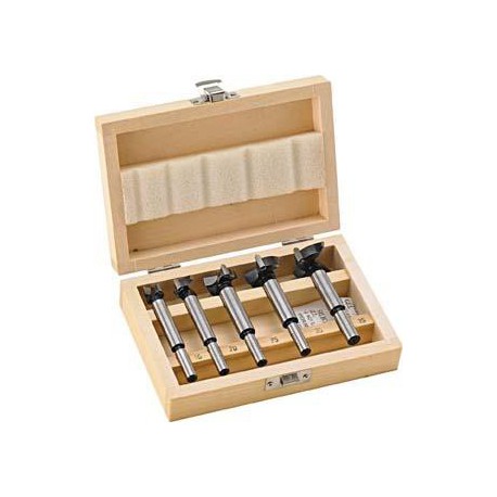 Juego de Broca de Fresa de disco cilíndrica HW, 5 piezas. Cuchillas MD, punta de centrar, dos precortadores, vástago cilíndrico escalonado, para perforar orificios en maderas duras, maderas encolada, tableros prensados o aglomerados y paneles plastificados. Suministro: en caja de madera. Contenido 5 piezas de 15, 20, 25, 30 y 35mm.