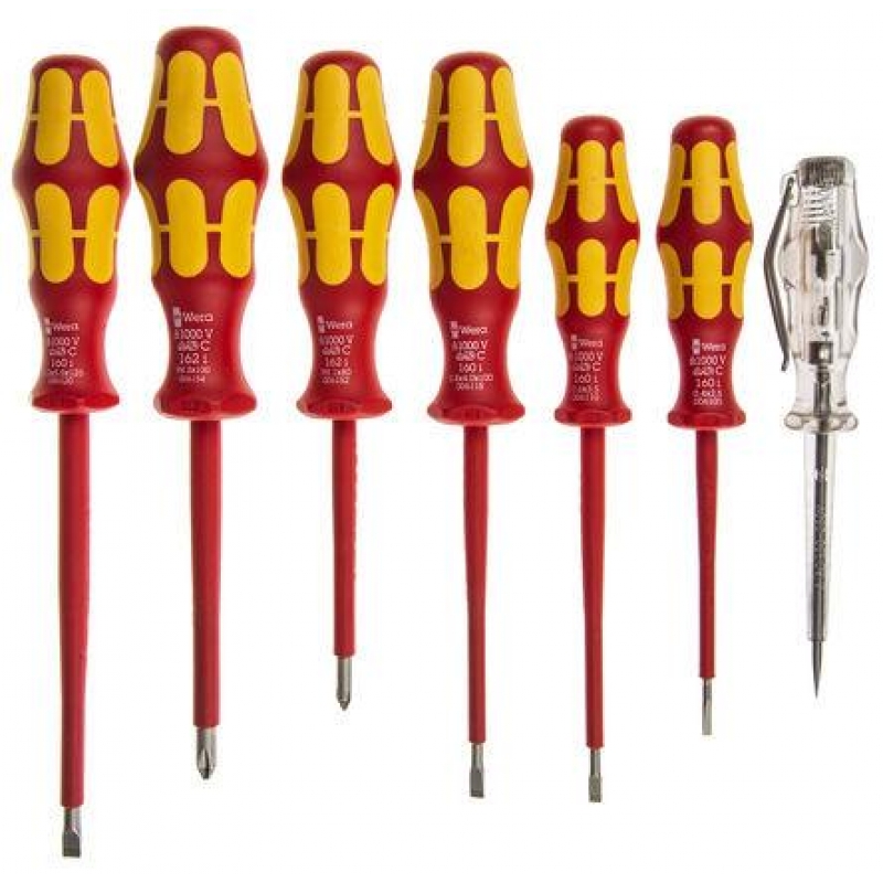 Juego de destornilladores 160i/7 1000v 7 piezas en embalaje de presentación + bandeja. Kraftform: el destornillador de seguridad. Con varilla Lasertip + buscapolos + bandeja. Para tornillos ranurados y Phillips. 1 x PH 1x80; 1 x PH 2x100; 1 x 0,4x2,5x80 (sin Lasertip); 1 x 0,6x3,5x100; 1 x 0,8x4,0x100; 1 x 1,0x5,5x125; 1 x 0,5x3,0x70.
