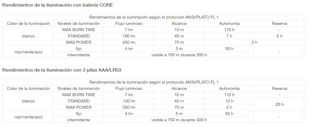 - Tres niveles de iluminación blanca: MAX BURN TIME (autonomía máxima), STANDARD (mejor equilibrio potencia/autonomía) y MAX POWER (potencia máxima).