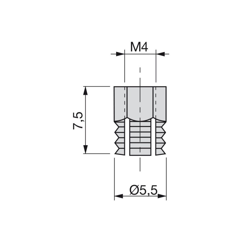 Lote de tuercas expansibles M4 con rosca métrica, fabricadas en latón y utilizadas para enroscar pernos o niveladores en todo tipo de muebles. Su instalación se realiza a presión en un tablero de madera con un taladro previo.