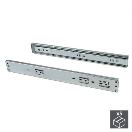 Guías de extracción total para cajones con cierre suave que proporciona un cierre amortiguado del cajón, y un deslizamiento suave y silencioso gracias a sus rodamientos de bolas de alta calidad. Destacan además por su gran capacidad de carga que puede llegar a soportar hasta 35 kg por cajón. Su montaje al cajón se realiza mediante tornillos y el desmontaje con un gatillo que posee la propia guía.