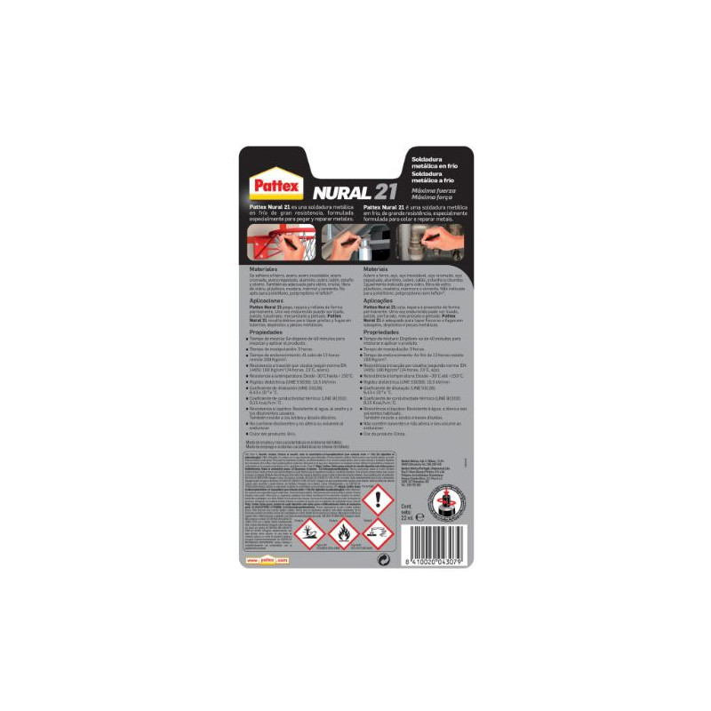 Pattex Nural 21 es una soldadura reparadora en frío de gran resistencia, formulada en especial para pegar y reparar metales. Sus acabados son de color gris. Además, no contiene disolventes y no altera su volumen al endurecer.