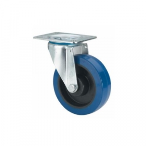 Ruedas de goma elástica azul. Especialmente indicada para soportar cargas hasta 120 Kg. Se aplica en útiles de transporte logístico, talleres, carros de herramientas, carros tubulares, logística interna, fabricas neumáticos, logística interna, útiles de transporte, carros de transporte de alimentación, cocina, cantina, comedor, supermercados, contenedores, roll-tainers, roll-palets, jaulas de transporte, cajas audio sonido, gradas móviles. Aplicadas en proyectos de ingeniería mecánica por delineantes y proyectistas. PGM: No mancha el suelo. Gran absorción de golpes y vibraciones. Ruedas suaves y silenciosas. Elástica.